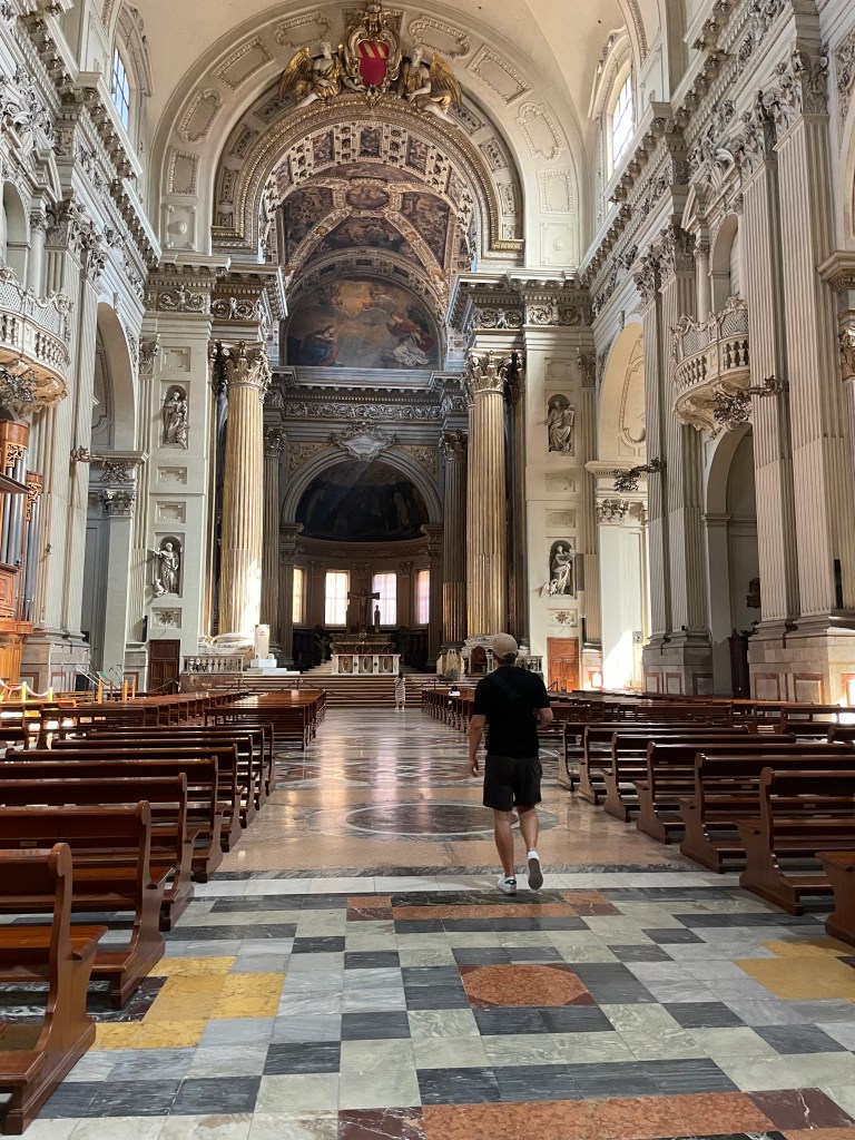 In Bologna, we took a walk to the Santuario di Madonna di San. You first have to climb a very large number of steps uphill before you reach this basilica. I’m not really into hiking myself, but my boyfriend really wanted to see it. On the plus side, it was a good way to burn off some of the calories from all the wine, pizza, and pasta we ate. I didn’t find the building particularly remarkable, but it was still nice to see. We also walked around the surrounding area, and from a distance, the basilica looks very beautiful on the hill.We also visited the Cattedrale di San Pietro, which I found really impressive, so I would definitely recommend seeing it. One thing that my boyfriend and I noticed in general in Italy is that Italians are not always very friendly. Perhaps we just met the wrong people, but it was something that really stood out to me and sometimes even annoyed me. We noticed this in Bologna as well.